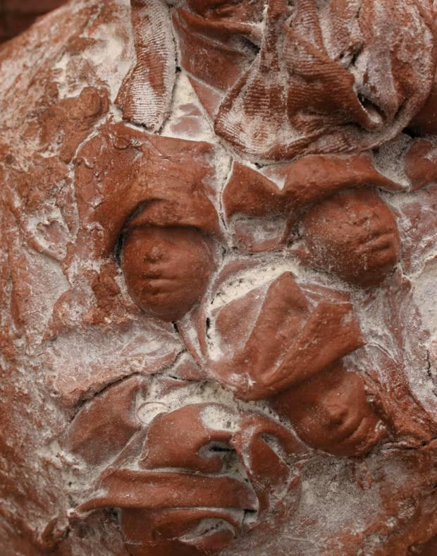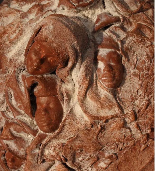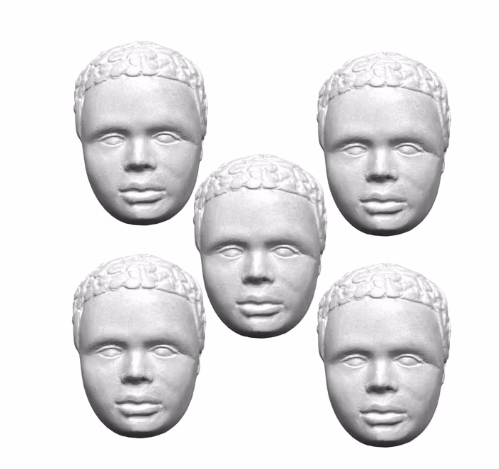 Man, set om fem halva huvuden, 3 x 5 cm